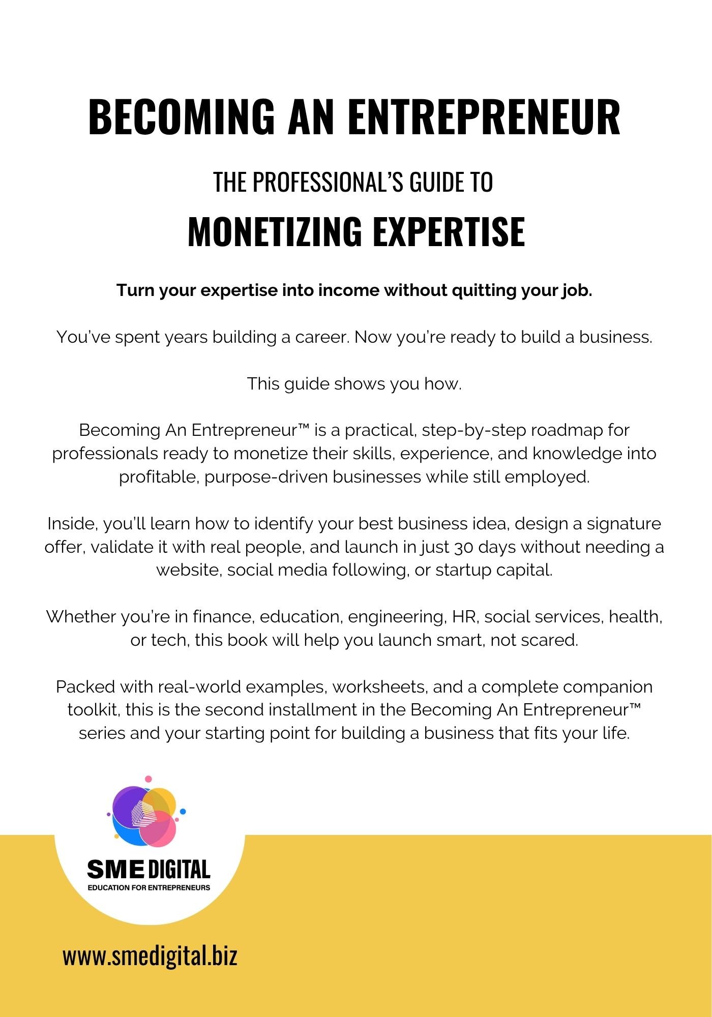 Becoming An Entrepreneur™ Professionals: The Guide to Monetizing Expertise is a complete roadmap for turning your career expertise into a profitable business without needing a website, social media following, or startup capital.